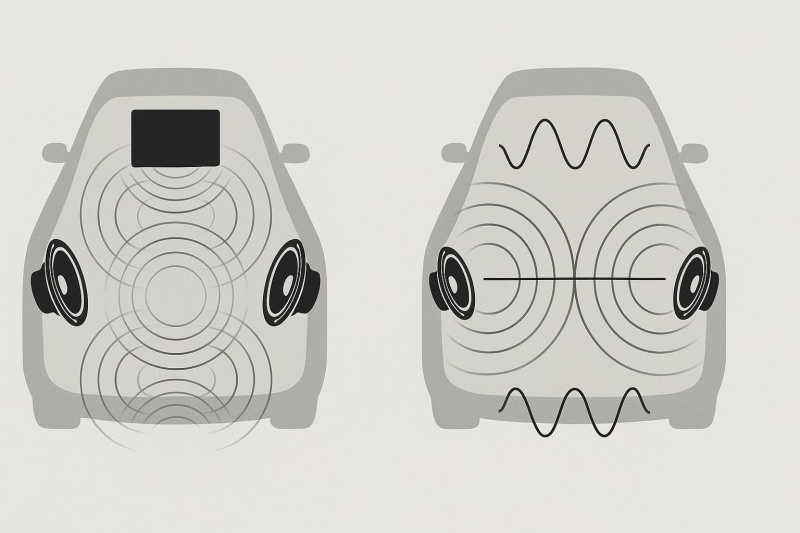 Если один источник начинает давить звук, а второй — чуть позже или в противофазе, то волны частично компенсируют друг друга. В автомобильном салоне с его отражениями и сложной геометрией эффект проявляется еще сильнее.