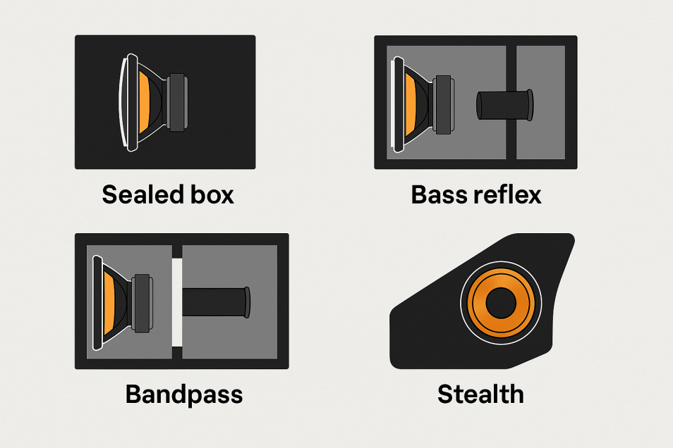 Формирует характер звука. Закрытый ящик дает быстрый и упругий бас, фазоинвертор — глубокий и мощный, а бандпасс — взрывную громкость;